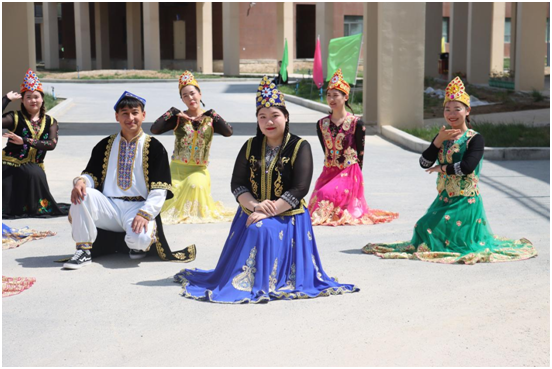 在自我介绍的时候,我选择了将新疆民歌《一杯美酒》改编歌词来唱给学生,展示自身的专业技能,随后将音乐切换为极具当地特色的新疆舞曲,邀请维吾尔族学生上台来跟随音乐一起舞动,将动作教给有舞蹈基础的汉族同学,再拉动全班同学一起舞蹈,塑造轻松愉快的课堂氛围,开启本学期的音乐课教学。