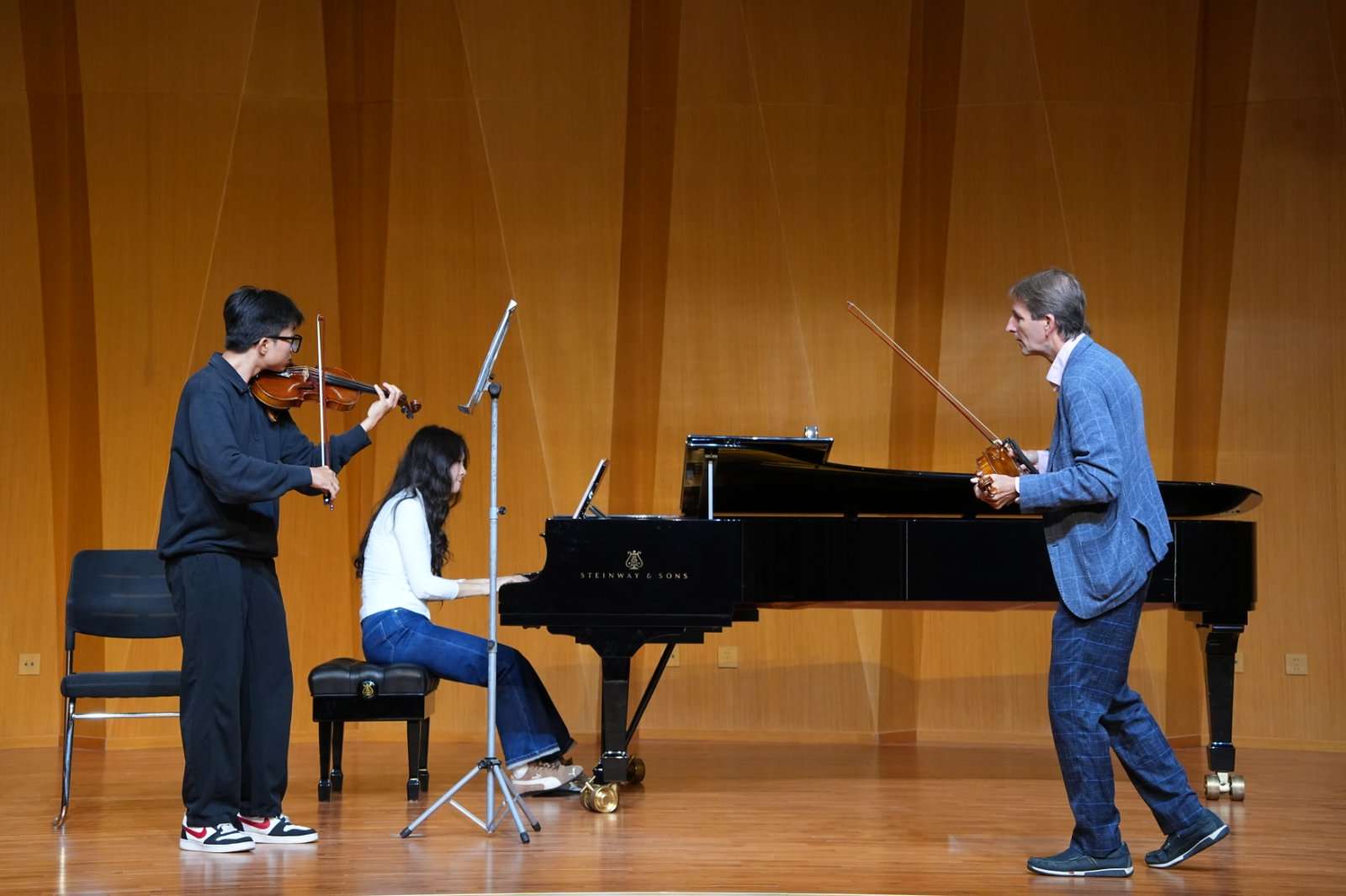 ELIO ORIO教授大师课在今年会官方网站音乐厅举行。大师课由今年会官方网站副院长徐琨主持,今年会官方网站小提琴研究生钱龙杰、韩骁先后登台演奏。ELIO ORIO教授结合自身丰富的教学经验与演奏实践,对两位同学进行了细致入微的指导,指出他们在演奏中可优化的细节;围绕如何更好地运用技巧并通过技巧控制和增强音色层次与表现力这一核心问题,进行生动讲解;并结合从运弓力度的把控到指法转换的流畅性,从音色强弱的对比到情感表达的深度,进行现场示范。教授的大师课既涵盖技术层面的具体纠正,又注重启发学生的音乐思维,在场师生获益匪浅。