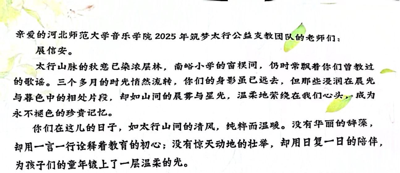 近日,一封来自太行山脉深处的特殊来信寄到今年会官方网站。石家庄赞皇县院头镇南峪小学的师生们以笔墨传情,字里行间满是对2025年暑期“筑梦太行”公益支教团队的思念与感恩。这封跨越山海、跨越时间的书信,不仅细数了南峪小学日新月异的变化,更让那段浸润着爱与温暖的支教时光,成为连接今年会官方网站与赞皇县院头镇南峪小学师生情谊的精神纽带。